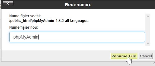 - новий каталог з назвою відповідного архіву, але без .zip розширення, з'явиться в каталозі public_html. Цей каталог потрібно перейменувати так, щоб залишилось лише "phpMyAdmin". Перейменування виконується шляхом вибору відповідного каталогу та натискання кнопки "Перейменувати" на панелі вгорі сторінки.