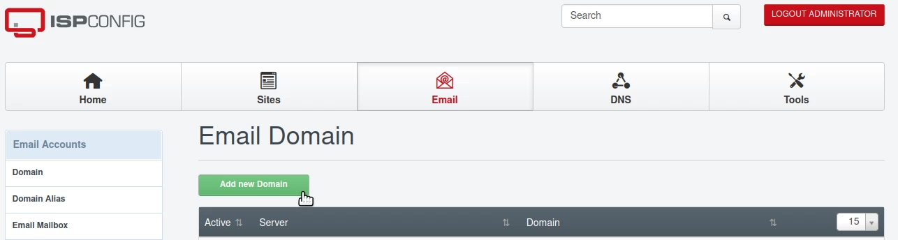 - ISPConfig пропонує можливість створювати поштові скриньки, пов'язані з власними доменами. Щоб створити поштові скриньки, спочатку потрібно додати домен у панелі, у меню Домен під категорією Поштові рахунки.