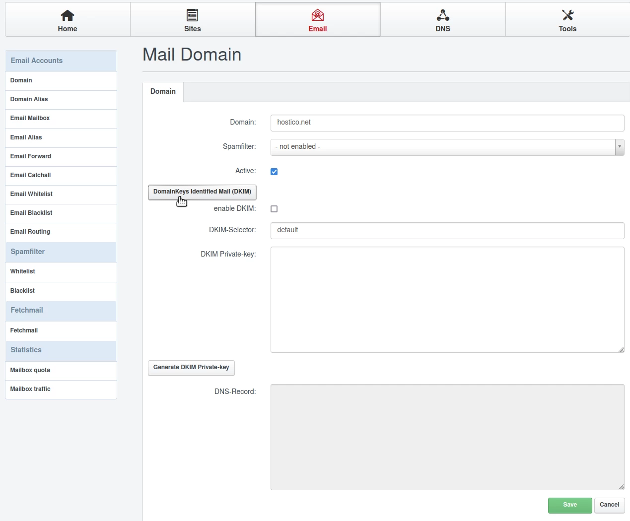 - Активний: Ми залишимо прапорець; Якщо ми хочемо також налаштувати DKIM (захист від спаму/фішингу), ми натиснемо кнопку DomainKeys Identified Mail (DKIM); Рекомендується пройти через цей етап також;