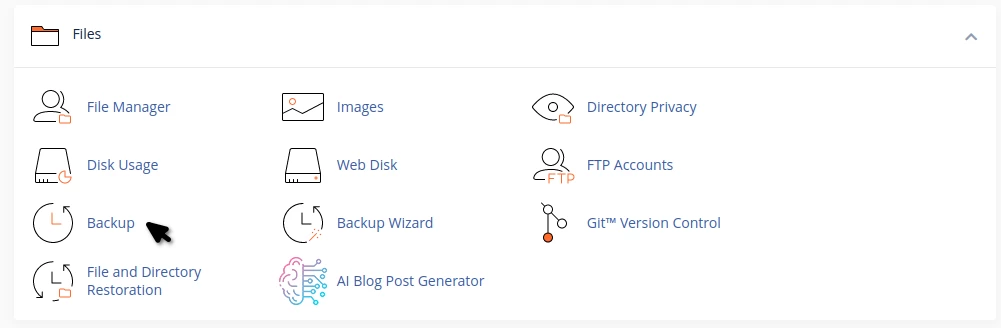 • Після входу в панель управління cPanel, у розділі FILES ми отримуємо доступ до плагіна Backup