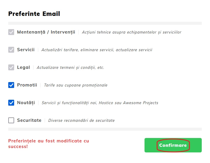 Оновіть електронні переваги в обліковому записі Hostico, щоб отримувати персоналізовані сповіщення про обслуговування, послуги, акції та безпеку.