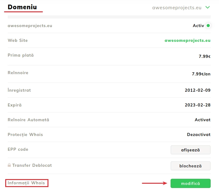 Після доступу до домену, на новій сторінці ми перейдемо до розділу Домен;- У цьому розділі секція WHOIS Інформація є цікавою