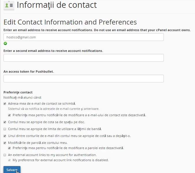 Примітка: Активування цих сповіщень допоможе нам уникнути несправностей із адресою електронної пошти через брак місця, як у випадку, коли вона повністю зайнята, так і в контексті безпеки нашого облікового запису cPanel та несанкціонованих змін наших облікових даних для входу.