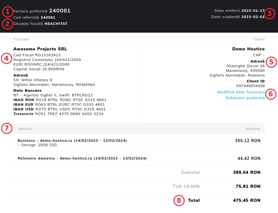 Дізнайтеся, як інтерпретувати проформу: номер рахунку, податковий статус, дані постачальника та клієнта, включені послуги та загальна сума до оплати.