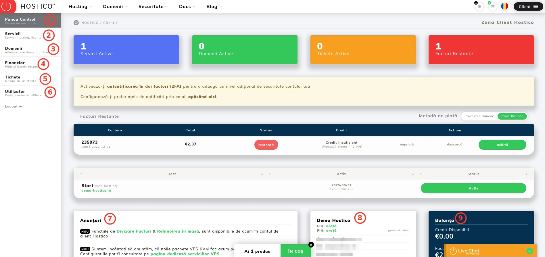 - (8) Hostico Demo - відображає унікальну інформацію з облікового запису клієнта, таку як ID або PIN-код;