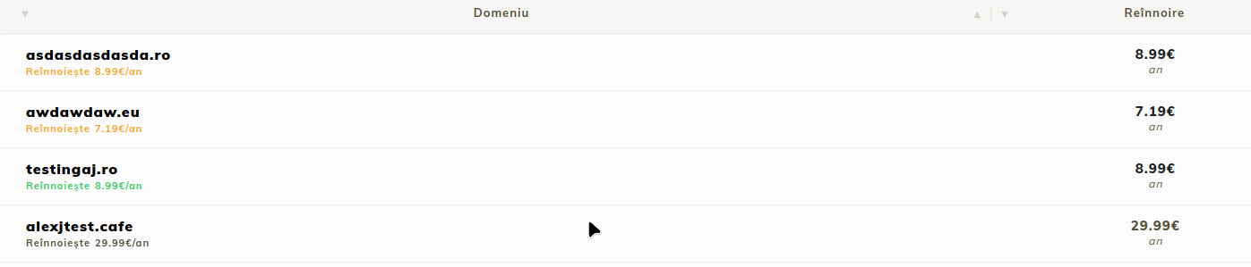 - Ваші домени, зареєстровані в Hostico, відображаються. Ви можете побачити ім'я, статус, залишковий активний період та вартість продовження.